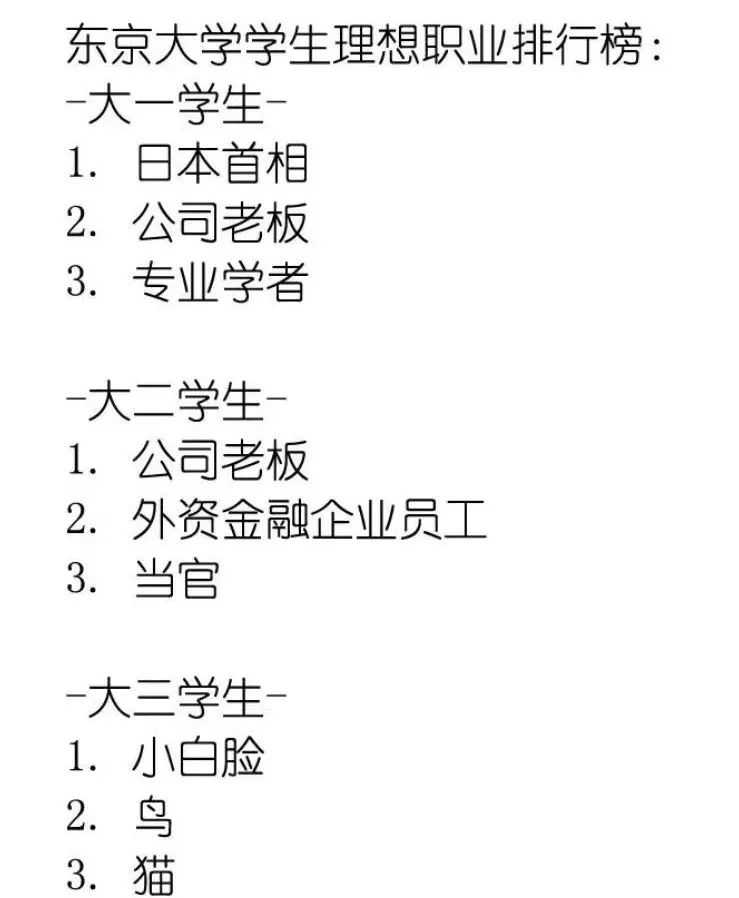 昨日推特上這張圖火了 東京大學(xué)學(xué)生抱負(fù)工作排行榜 不同年級(jí)的同學(xué)差別很大呢