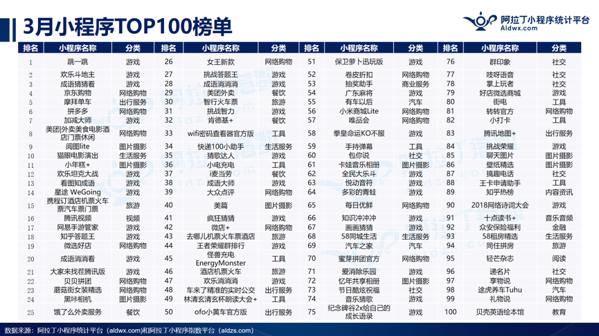 2018年4月18日,阿拉丁小程序核算途徑和阿拉丁指數一同發布了2018年3月TOP100小程序榜單。阿拉丁核算途徑和阿拉丁指數在榜單的實時性、算法、樣本數量、多職業維度(添加了小程序游戲、外交、轎車、圖片拍照等)四個方面進行了全面晉級。