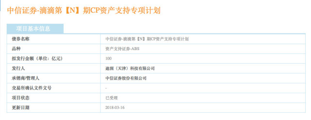 3月17日,上海證券交易所公司債券項目信息渠道顯現,中信證券-滴滴第【N】期CP財物支撐專項方案于昨日受理。