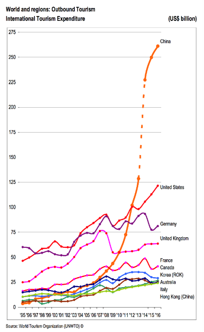 據統計,2016年我國出境花費到達2900億美元,居國際之首。我國以4%的護照持有率,變成全球出境花費額最高的國家。在將來五到十年內,跟