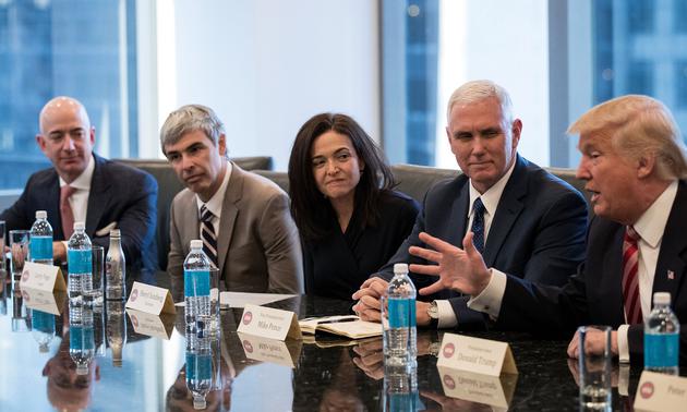 2016年12月,特朗普當選美國總統(tǒng)后曾召集硅谷著名企業(yè)家商議,圖中左起分別為亞馬遜CEO杰夫-貝索斯、谷歌母公司Alphabet CEO拉里-佩奇