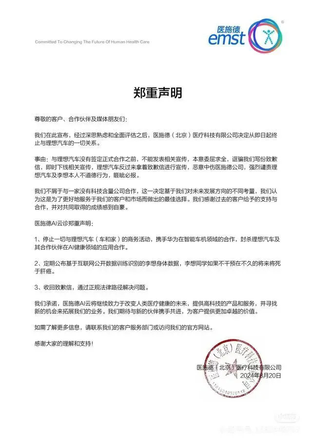 8 月 19 日,一份醫(yī)施德發(fā)布的與理想汽車相關(guān)的聲明在社交平臺流傳。聲明稱,醫(yī)施德將從即日起終止與理想汽車的一切關(guān)系。 聲明指出,