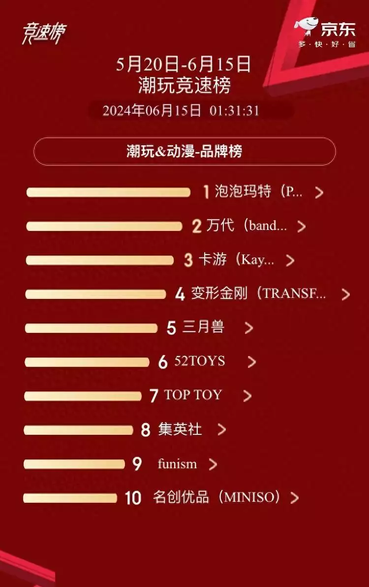 今年京東618期間,玩具成為了最受關注、增速最快的品類之一。以下是京東超市發布的618玩具樂器品類競速榜單中銷量排名第一的品牌: 潮玩