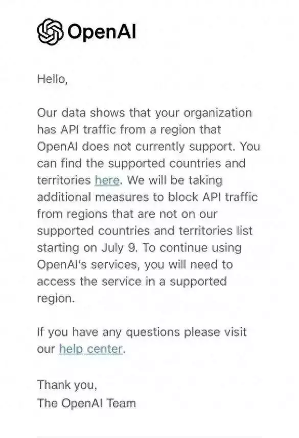 6月25日,OpenAI向中國用戶發布郵件稱,自7月9日起阻止來自非支持國家和地區的API流量。這意味著OpenAI將終止對包括中國大陸在內的地區提供API服務。