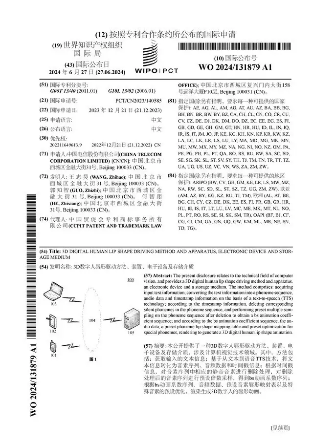 證券之星消息,根據企查查數據顯示,中國電信(601728)公布了一項國際專利申請,專利名為“3D 數字人唇形驅動方法、裝置、電子設備及存儲介質”,