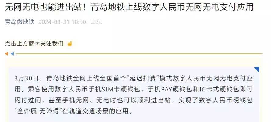 青島地鐵在2024年3月30日全網上線了全國首個“延遲扣費”模式的數字人民幣無網無電支付應用,這一創新舉措使得乘客即使在手機無網、無電的情況下,也能順利進出站。