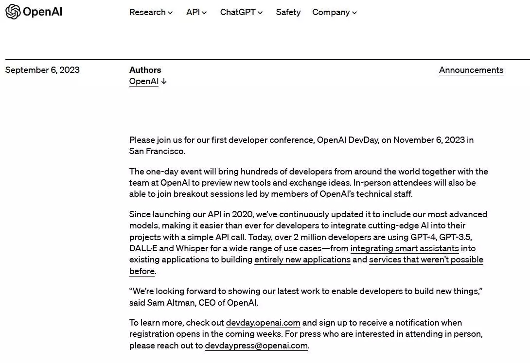 9月7日電 當地時間6日,美國人工智能公司OpenAI在官網發布公告稱,將于11月6日在舊金山舉辦公司的首屆開發者大會。 公告介紹,