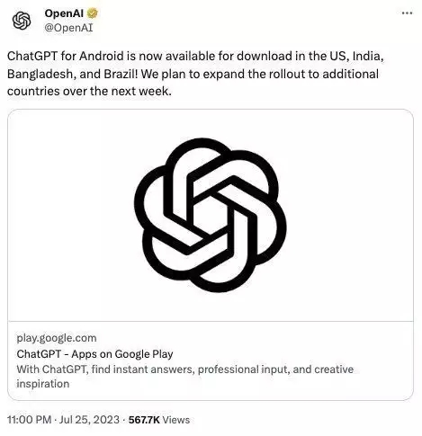 7月26日訊,OpenAI經(jīng)過(guò)其官方推特宣告,安卓版ChatGPT現(xiàn)在在美國(guó)、印度、孟加拉國(guó)和巴西供給下載,并計(jì)劃在下周將其推行至更多國(guó)家。