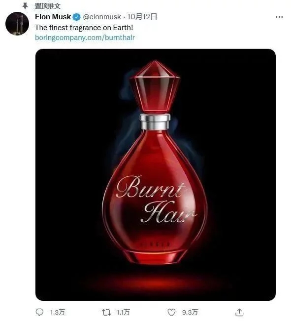 造飛船的馬斯克,仍有閑情逸致賣香水。 近日,馬斯克在個人交際渠道上發(fā)布一款名為“燒焦頭發(fā)(Burnt Hair)”的香水,