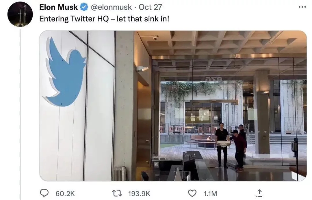 馬斯克來了——Let that sink in. 周四,爛梗王馬斯克真就這樣抱著一個水槽,推開了 Twitter 公司舊金山總部的大門。