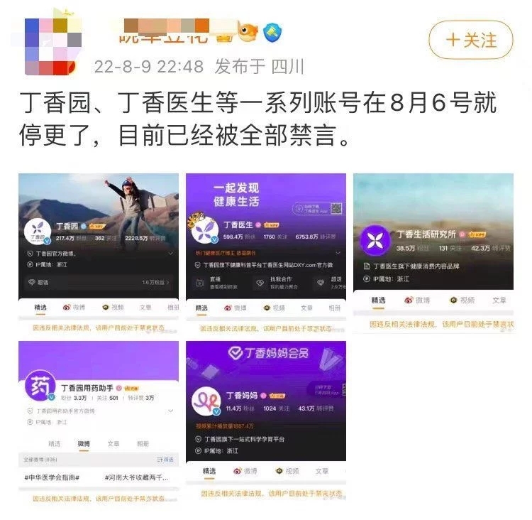 8月10日音訊,針對(duì)丁香園旗下系列微博賬號(hào)被禁言一事,據(jù)齊魯壹點(diǎn)報(bào)導(dǎo),丁香園工作人員回應(yīng)稱,公司部分社交媒體賬號(hào)因平臺(tái)要求,