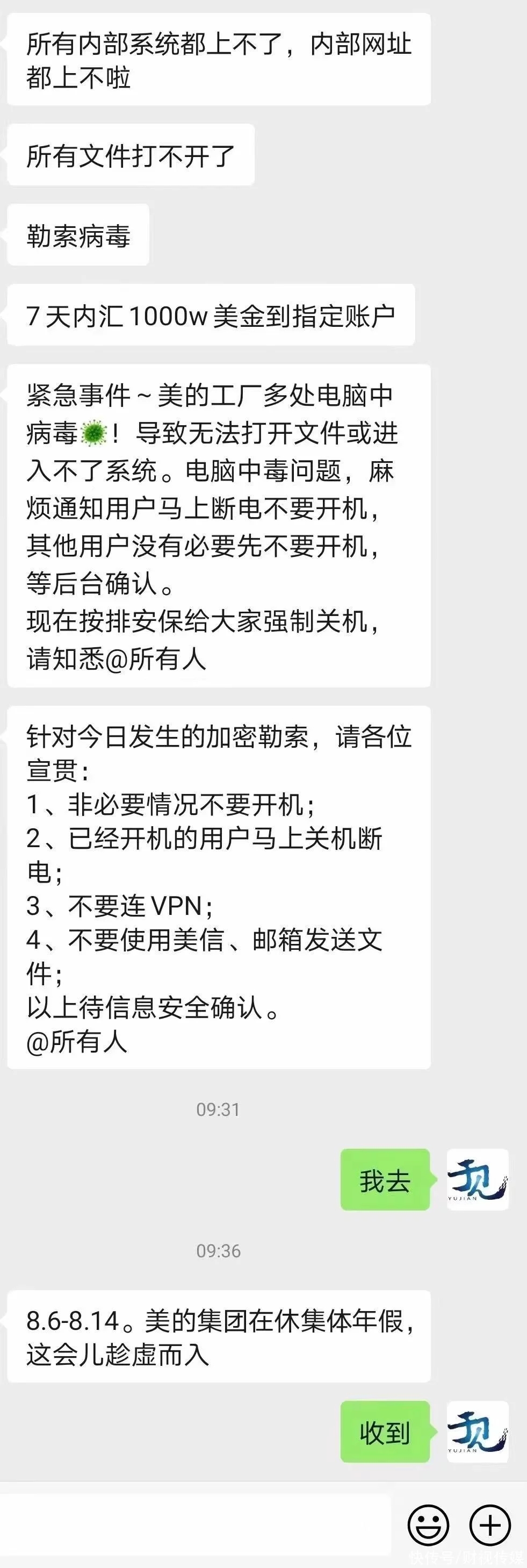 8月11日晚間,微博@美的集團(tuán)針對(duì)“公司內(nèi)網(wǎng)遭受電腦病毒侵略,被勒索1000萬(wàn)美金”風(fēng)聞發(fā)布說(shuō)明。美的表明,8月11日,美的集團(tuán)遭受新型網(wǎng)絡(luò)病毒進(jìn)犯,