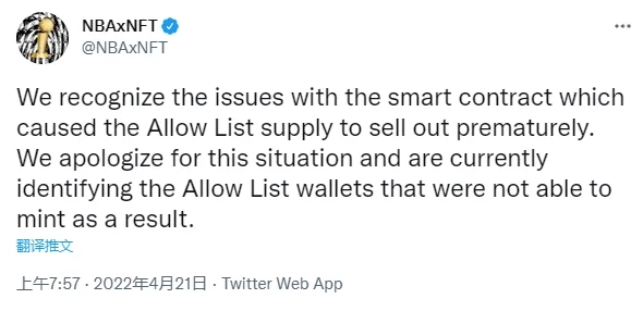4月21日音訊,美國國家籃球協會(NBA)旗下NBAxNFT官推特發文稱:“咱們認識到智能合約的問題,它導致白名單供應提早售罄。目前正在識別白名單中無法鑄造NFT的錢包。”