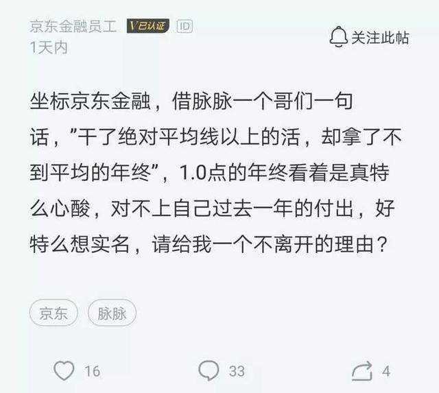 發年終獎的日子,有人歡喜有人憂。在互聯網行業社區,一名標簽為京東金融的職工顯得分外憤慨,發飆起來:干了絕對均勻線以上的活,卻拿了不到均勻的年終,