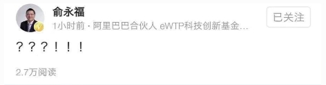 就在楊偉東的新聞爆出后,外界發(fā)現(xiàn)前阿里巴巴集團大文娛董事長俞永福發(fā)了一個狀態(tài),一個字沒寫,只有三個問號和三個感嘆號。