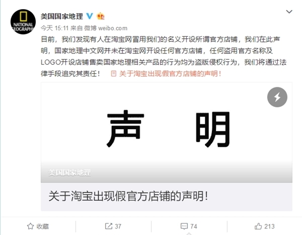 12月6日,美國國家地理官方微博發(fā)布聲明稱,淘寶有店肆盜用自己的Logo,出售盜版日歷,將會通過法律手段保護公司的權(quán)益和利益。