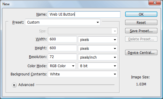 第1步:創(chuàng)立Photoshop文檔 該按鈕大小(寬x長)170像素x50像素。我們的畫布大一點,比如設(shè)為600像素x600像素