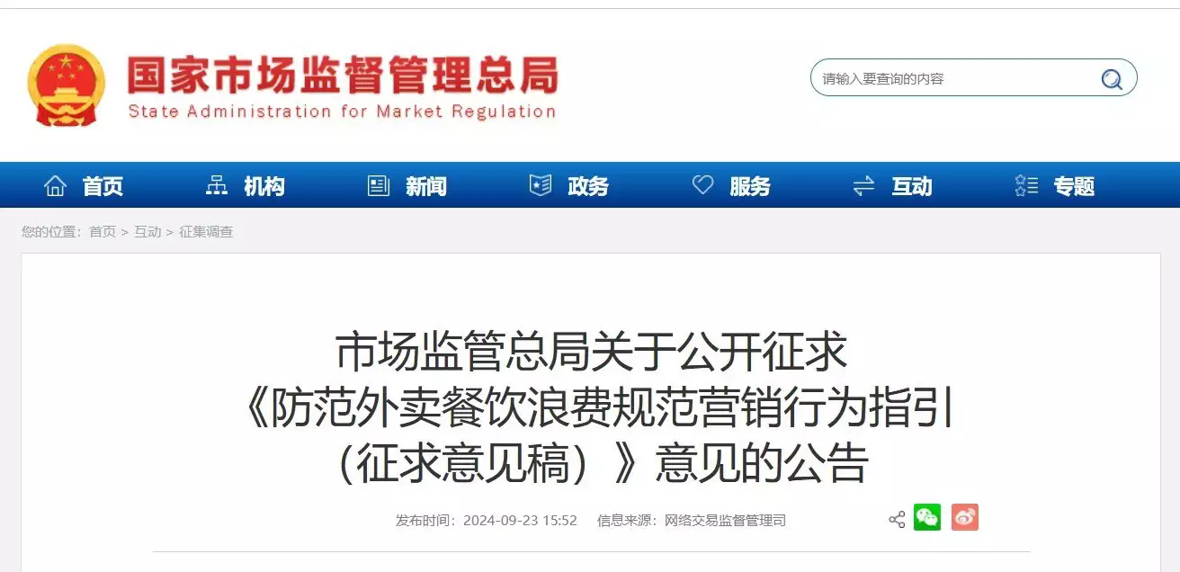 市場監(jiān)管總局 9 月 23 日發(fā)布公告,公開征求《防范外賣餐飲浪費規(guī)范營銷行為指引(征求意見稿)》(下稱《征求意見稿》)意見。市場監(jiān)管總局鼓勵外賣商家合理設(shè)置起送價格并積極提供小份餐品具有多方面的積極意義。